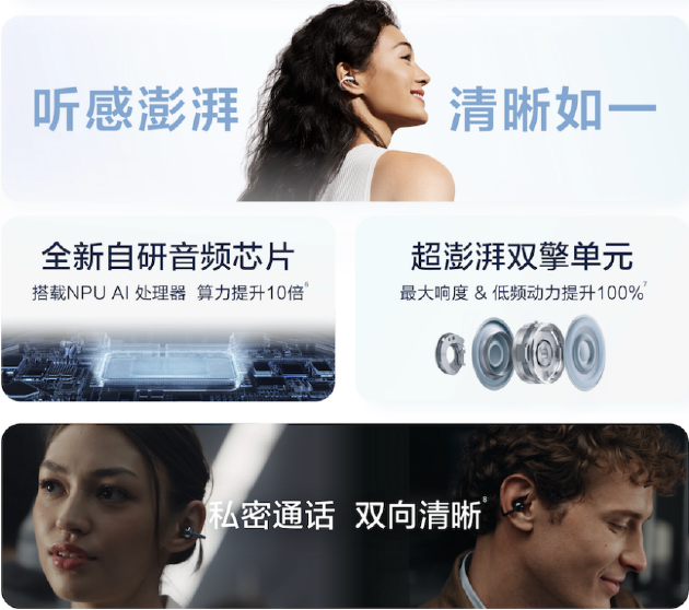 听音露出方面,华为FreeClip 2 耳夹耳机也带来了令东说念主惊喜的突破,其搭载全新华为自研第三代音频芯片与NPU AI处理器,使耳机算力升迁10倍,为种种音频处理提供了浩瀚复古。其中,“智感音量自符合”功能可及时检测环境噪声并自动调换音量,让用户在喧闹的街说念或咖啡馆中齐能保持明晰凝听;“双向明晰通话”则通过三麦克风通话降噪系统,互助多通说念 DNN 降噪算法,确保即使在嘈杂环境中通话,两边齐能获取明晰纯洁的通话体验。极度值得关注的是,华为初度在耳夹耳机中取舍“超澎湃双擎单位”,带来响度与低频能源100%的升迁,调动了绽开式耳机听感单薄的刻板印象。这关于正常可爱听电子乐、重低音的用户来说,升迁会相称较着,低音愈加实足且有档次感,且每处饱读点的节拍齐更具冲击力,让用户尽情享受音乐的每一个波动。2025年年底,华为FreeClip 2还将升级全新星闪音频体验,不妨期待一下。