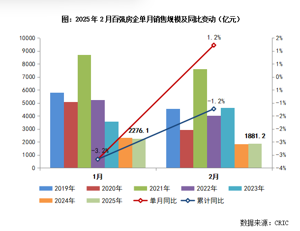 2025年2月,中国房地产阛阓延续止跌回稳态势,肖似春节假期要素影响,合座保合手低位启动。2月,TOP100房企收尾销售操盘金额1881.2亿元,同比增长1.2%,单月事迹领域保合手在历史较低水平。